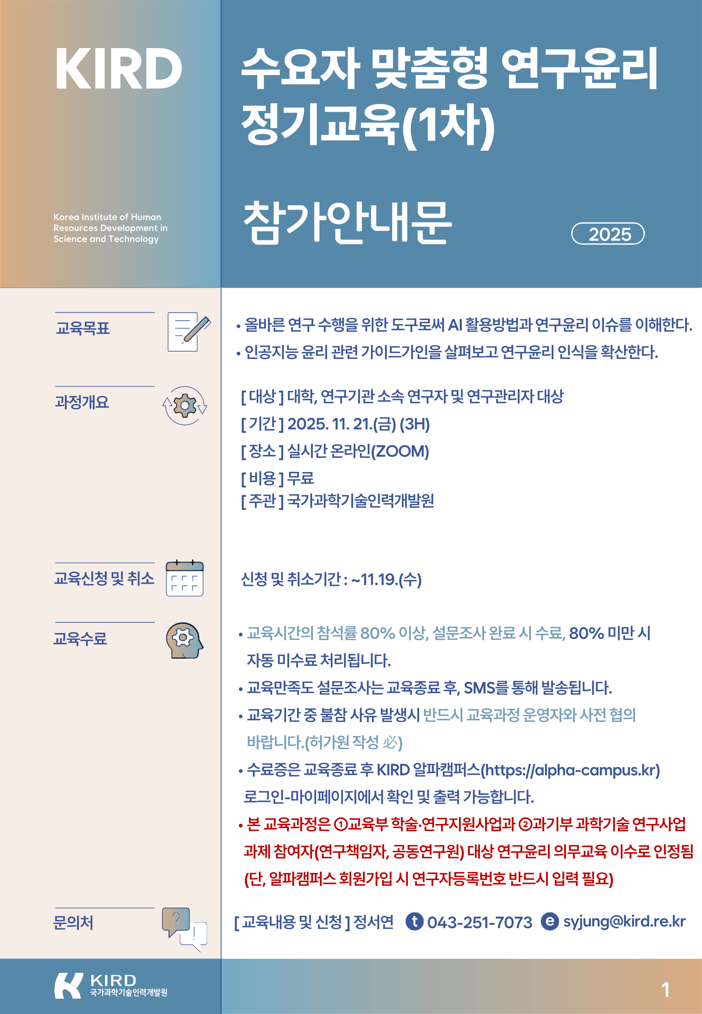 ※ 수요자 맞춤형 연구윤리 정기교육(1차) 신청링크: https://link24.kr/1RFIarV